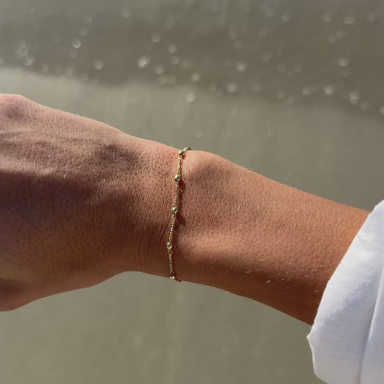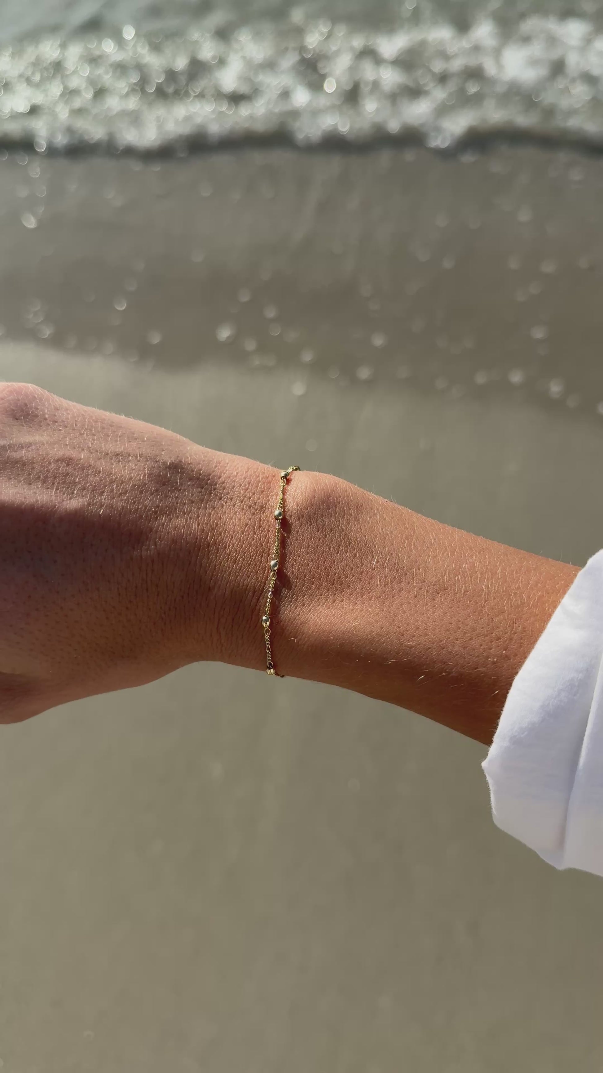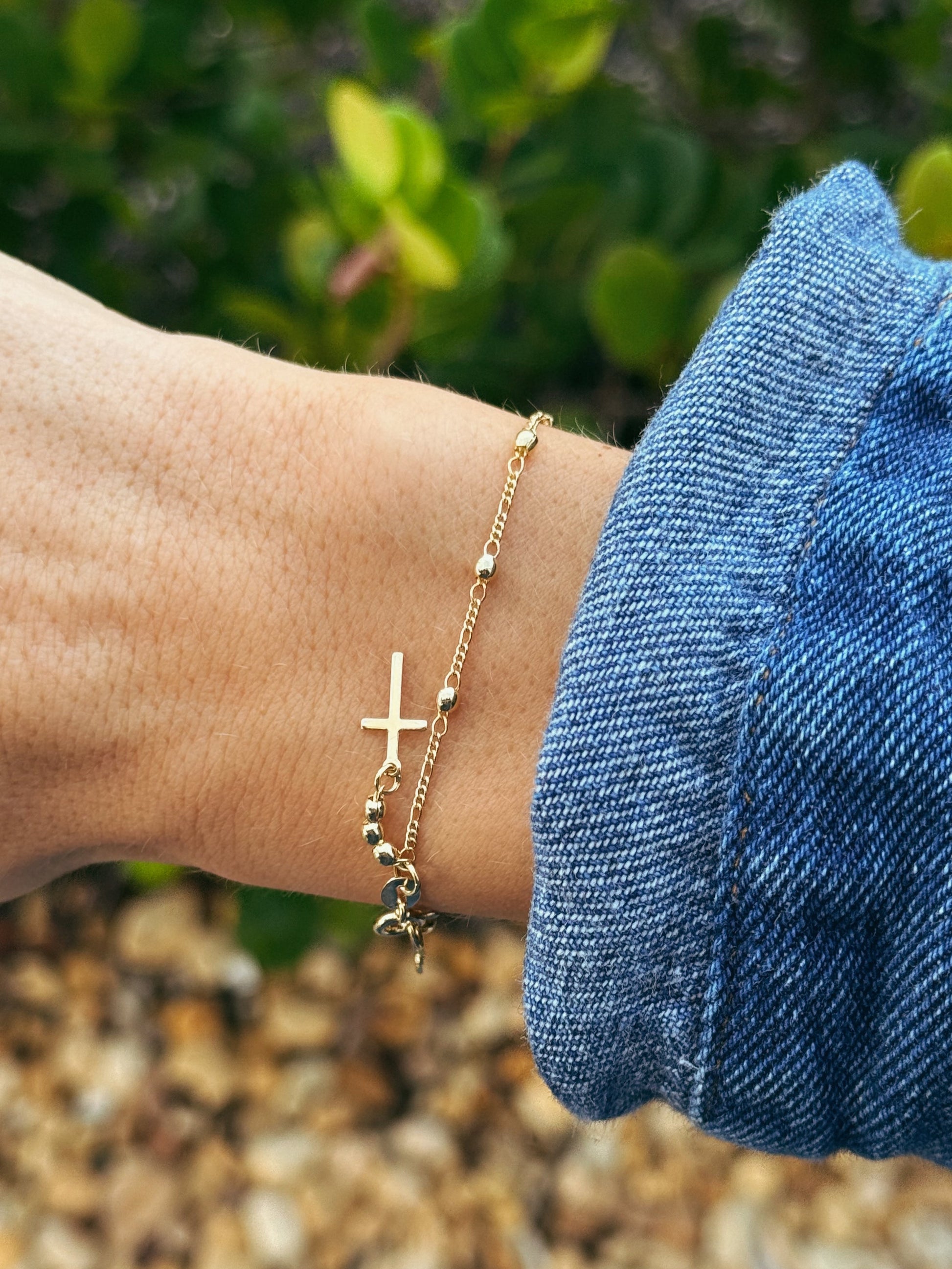 The Ave Bracelet is a daily-wear rosary bracelet designed to keep prayer close at hand. It’s intentionally minimal so it integrates effortlessly into everyday life. Made with 10 gold beads and 3 at the clasp.. complete with a cross as a reminder to pick up and carry your cross daily.